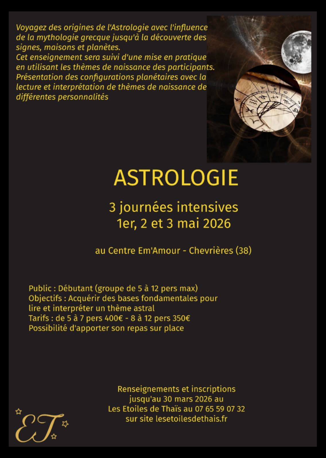 Voyagez des origines de l’Astrologie avec l’influence de la mythologie grecque, jusqu’à la découverte des signes, des maisons et des planètes avec leurs configurations. Cet enseignement sera suivi de mise en pratique en utilisant les thèmes de naissance des participants